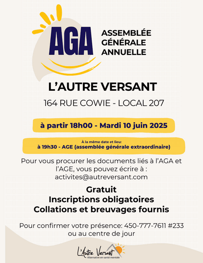 L’Assemblée générale annuelle (AGA) et l’Assemblée générale extraordinaire (AGE) de L’Autre Versant se tiendront le 10 juin 2025, au 164 rue Cowie, local 207, à Granby. L’AGA débutera à 18 h, suivie de l’AGE à 19 h 30.